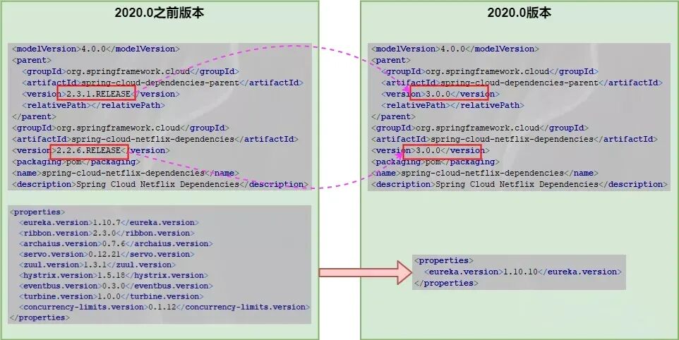 时至今日,Spring Cloud 2020.0 正式发布,在这个主要版本里,按既定计划终于对 spring-cloud-netflix 动刀了。我帮你画了幅 spring-cloud-netflix-dependencies 的 xml 文件前后版本主要差异的对比图,一目了然:
