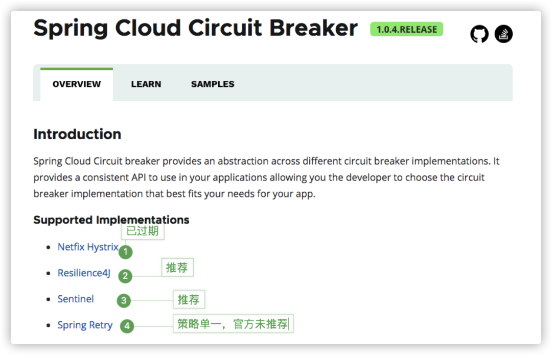 正如上文所述 Spring Cloud 提供了强大的封装和抽象能力,例如 spring-cloud-circuit-breaker 提供了对常见容错组件的封装,在使用过程中也不需要考虑 @hystrixcommand@SentinelResource 组件原生注解。