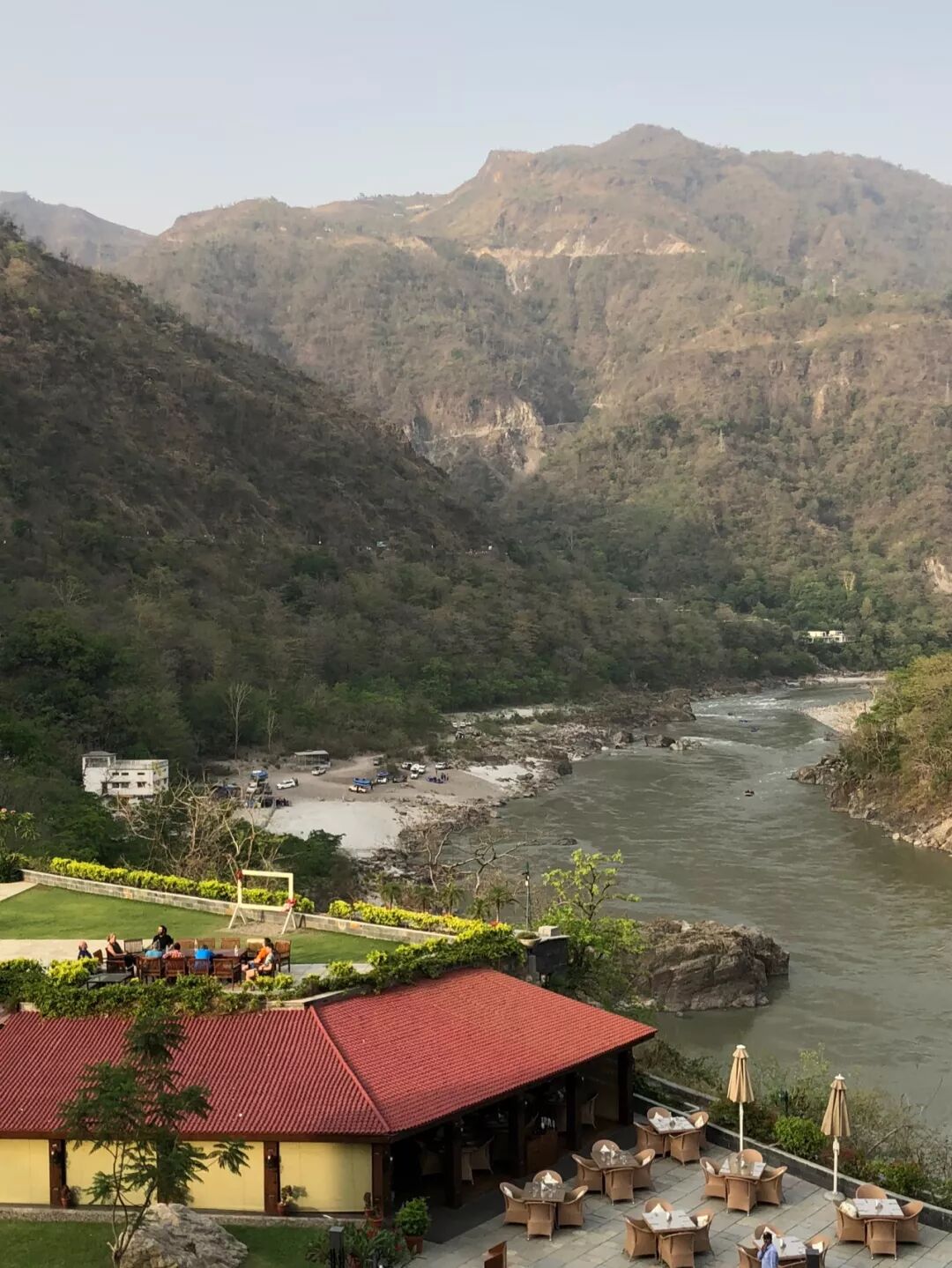 酒店就在恒河边上,注意那一片白色的沙滩。我们徒步路线就是从那边绕过去。