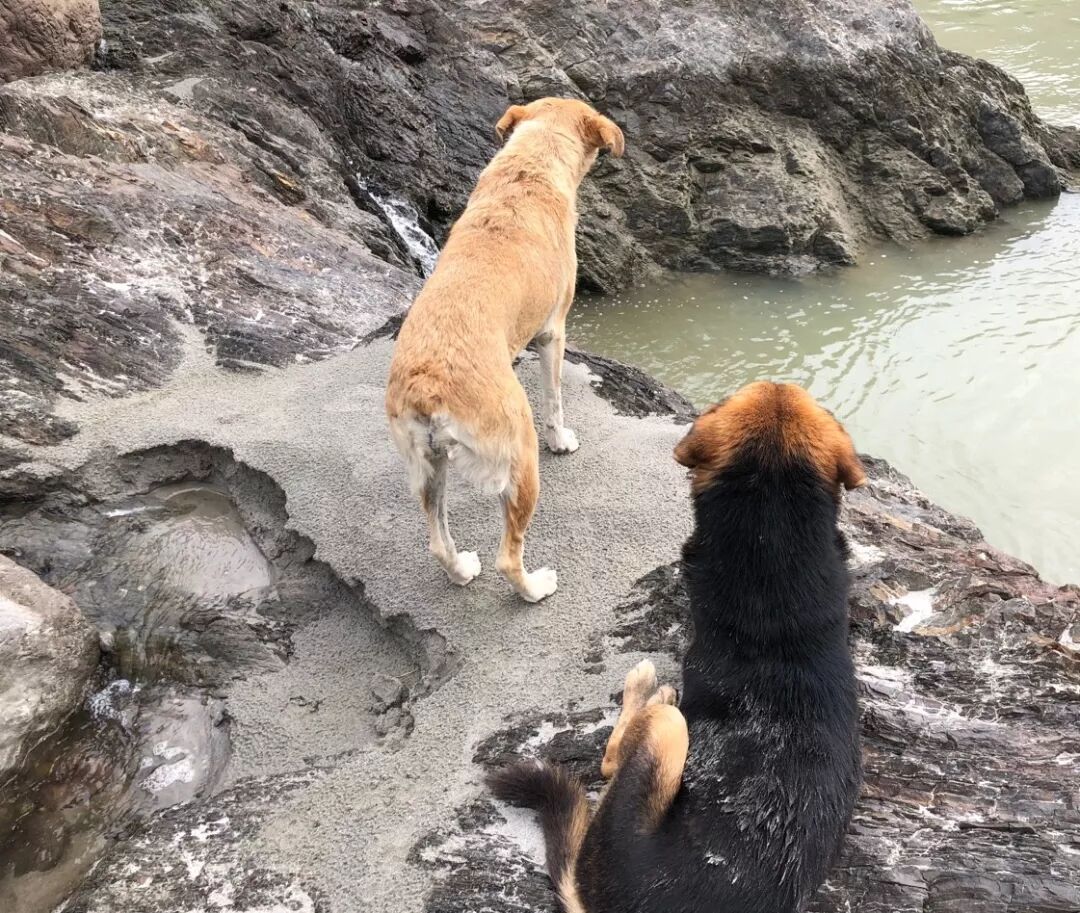 然后我们就沿着河边走啊走,走啊走,走啊走…… 河边有很多鹅卵石,被河水冲刷的浑圆,可以挑选一两个做纪念。有两只狗一直跟我们走了很远,但是我没告诉它们俩,我可没买方便面和面包。