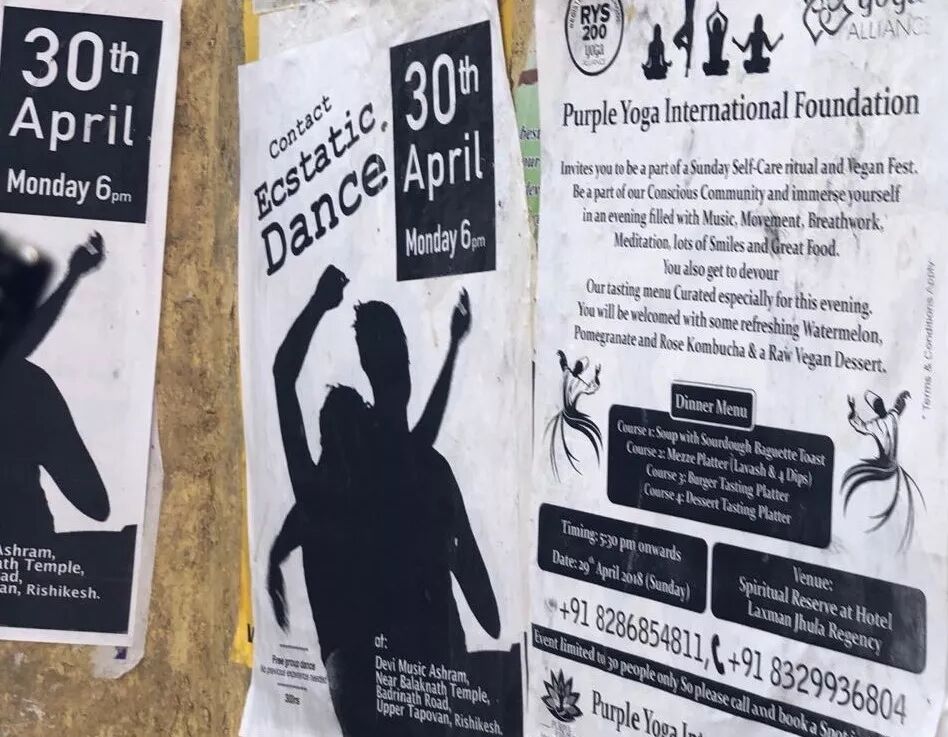 瑞诗凯诗号称瑜伽圣地。所以这地方的瑜伽班、灵修班的小广告也随处可见,路旁也看到各种修炼的场地。看着都破破烂烂的,我不知道这些人来到这个地方是否能找到心灵的宁静,但来到这里的外国人的确是多,包括我们,也是外国人。