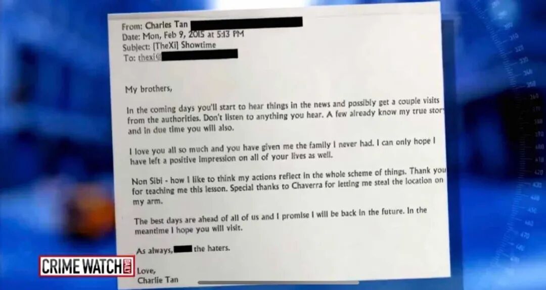 在谭母报警枪击前约一小时,康奈尔大学的兄弟会成员在下午5点13分都收到了一封来自查理的邮件。
