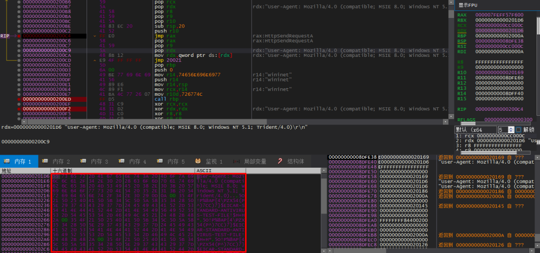 8.调用HttpOpenRequestA,HttpSendRequestA等函数向服务器发送连接请求,如下所示: