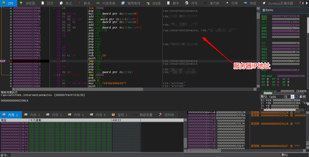 7.调用InternetOpenA,InternetConnectA等函数连接服务器,如下所示:
