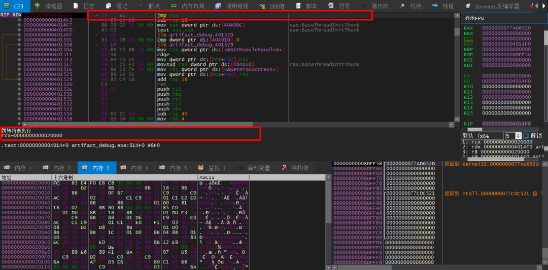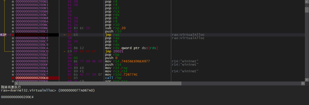 5.跳转执行解密出来的shellcode代码,如下所示: