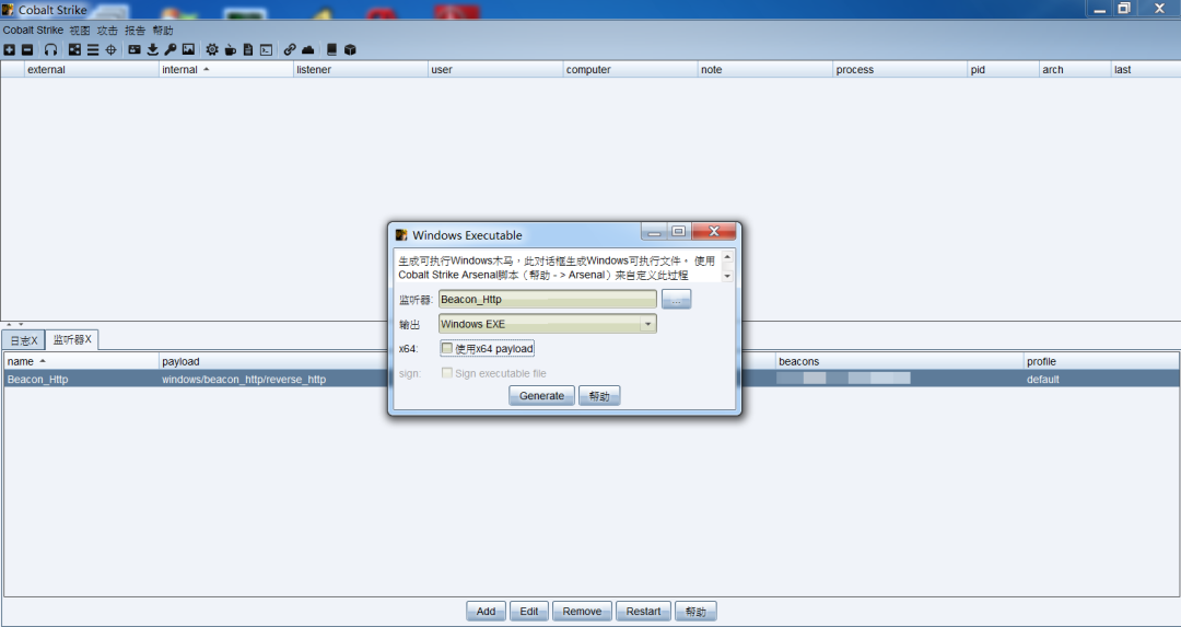 启动Cobalt Strike客户端,生成EXE后门,如下所示:
