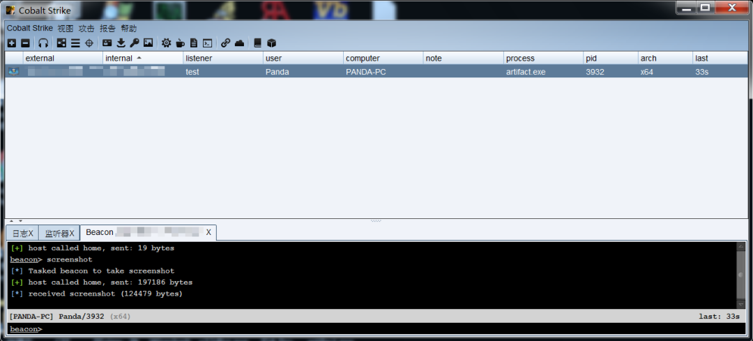 生成EXE后门之后在测试机上运行,客户端会提示有主机上线,开启beacon操作接口,如下所示: