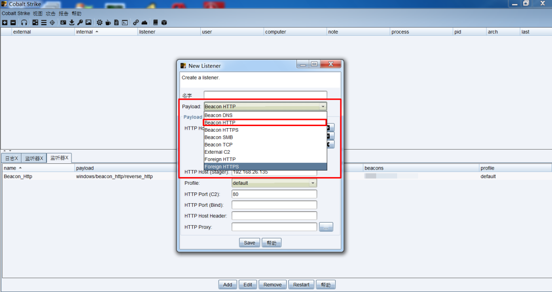 Cobalt Strike监听器的Payload可以自定义设置,我这里以Beacon HTTP为例,如下所示: