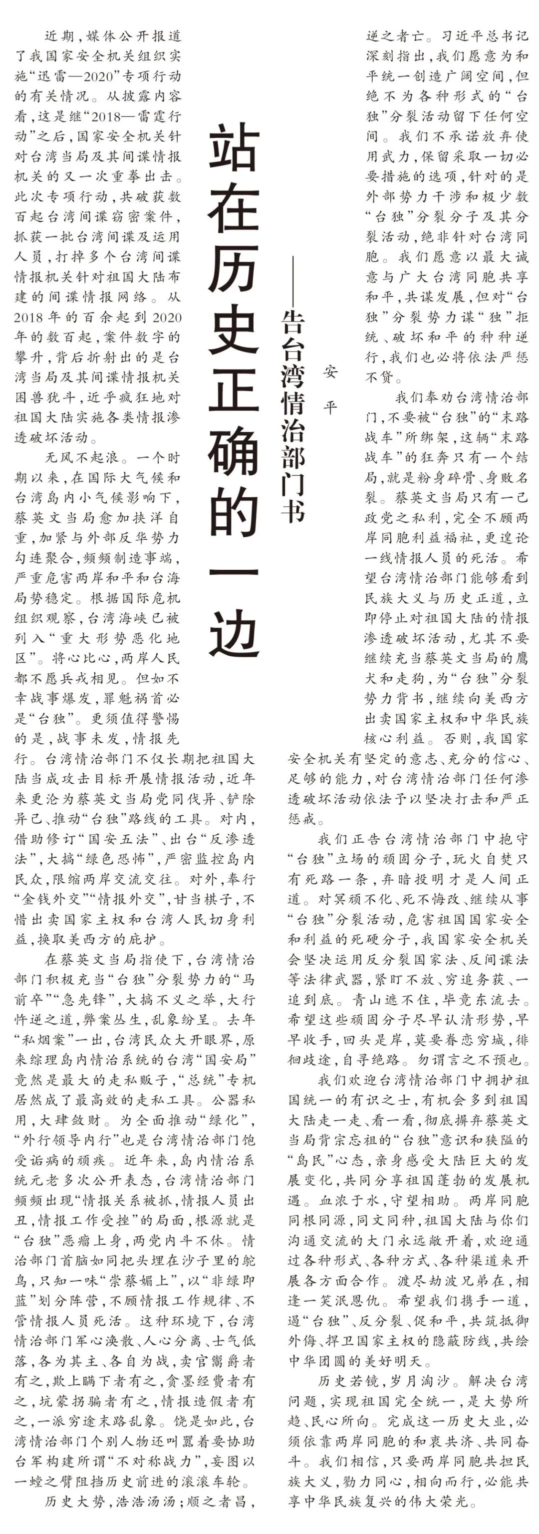 无风不起浪。一个时期以来,在国际大气候和台湾岛内小气候影响下,蔡英文当局愈加挟洋自重,加紧与外部反华势力勾连聚合,频频制造事端,严重危害两岸和平和台海局势稳定。根据国际危机组织观察,台湾海峡已被列入“重大形势恶化地区”。将心比心,两岸人民都不愿兵戎相见。但如不幸战事爆发,罪魁祸首必是“台独”。更须值得警惕的是,战事未发,情报先行。台湾情治部门不仅长期把祖国大陆当成攻击目标开展情报活动,近年来更沦为蔡英文当局党同伐异、铲除异己、推动“台独”路线的工具。对内,借助修订“国安五法”、出台“反渗透法”,大搞“绿色恐怖”,严密监控岛内民众,限缩两岸交流交往。对外,奉行“金钱外交”“情报外交”,甘当棋子,不惜出卖国家主权和台湾人民切身利益,换取美西方的庇护。