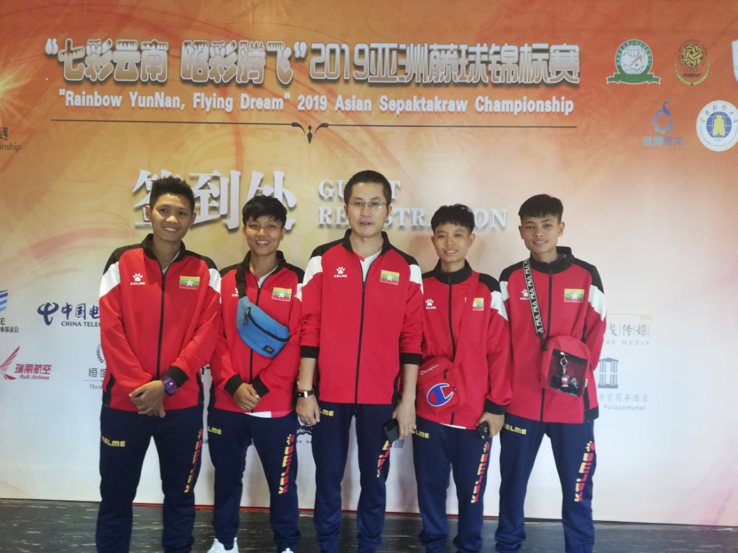 武玉铜(右3)带领缅甸男子和女子藤球队参加在昆明举办的2019亚洲藤球锦标赛