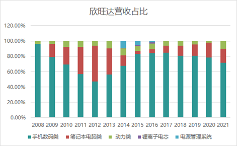 但它此刻面临的一个问题是:当下欣旺达的市值也不过503亿元,距离这份“鸿图”还差了两百多亿。截至今年一季度,欣旺达账面上货币资金为102.6亿元,但有息负债已达到261.26亿元,资产负债率高达66%。从2014年发力动力电池以来,欣旺达负债率就始终高于60%水平,2020年甚至一度达到了76.7%。对于高企的杠杆水平,欣旺达在投资者互动平台表示,将通过股权融资、优化账期管理和提高中长期债务融资比例三种方式降低负债率。2016年,《21世纪经济报道》一篇文章曾提到,欣旺达创始人兼董事长王明旺在“毫无征兆”的情况下,以“个人原因”提出辞职。辞职之后,王明旺仍然为公司实际控制人,在公司担任顾问业务。据业内人士指出,王明旺辞职或与其2015年因未按规定减持受到证监会处罚,导致公司三年期间不得增发重组有关。但考虑到目前在欣旺达的营收结构中,手机数码类电池占比仍然超过70%,或许这一次略带风险的冲锋并非毫无原因。在开启扩张后的2021年年报中,欣旺达动力电池营收占比再次升高,同比增长高达584.67%。