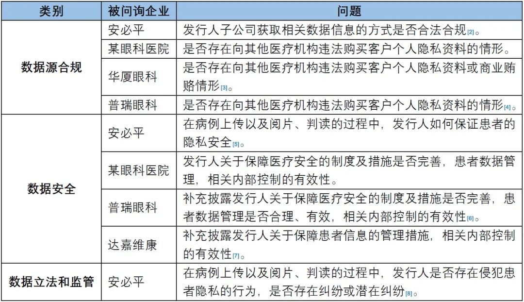 基于上述公司的招股说明书、审查反馈意见、问询函、发审委会议审核公告等文件,同时结合笔者在之前《科技企业上市之数据合规(上)——审核要点篇》、《科技企业上市之数据合规(中)——识别风险篇》、《科技企业上市之数据合规(下)—— 数据合规治理篇》一文中梳理的“企业上市须应对的数据合规重点问题”的分类方式,我们针对上述公司涉及的数据合规问题进行梳理,以期全面展现拟上市健康医疗企业将面临的数据合规问询。