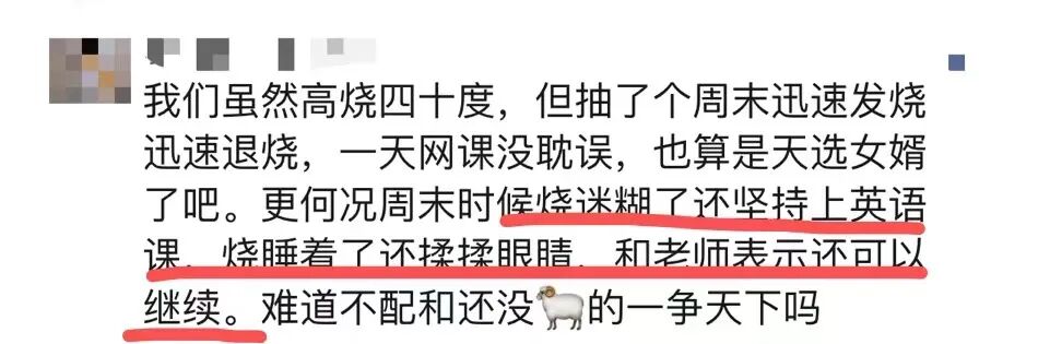 不管是普通的病毒感冒发烧还是新冠,只要生病了就应该休息,难道你们平时孩子生病了也坚持上课吗?孩子都烧得迷糊了睡着了还要强行清醒过来上课,这个“比比谁的娃更爱学习”的风气千万不要有啊!