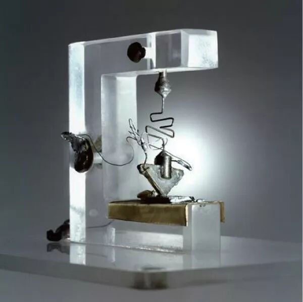 此时已经到了1947 年11 月,肖克利在小组里表现得没有之前那么活跃了,他开始自己在家里思考一种别的思路,并去研制固体放大器,但他并没有告诉小组里的其他人。小组的工作重点围绕巴丁和布拉顿展开,11 月21 日,他们二人开始具体讨论研制半导体放大器的方案。在他们设计的电路中,有一部分是这样的,将一滴蒸馏水滴在了晶体表面作为电解液来改变半导体表面的电荷分布,然后又用薄石蜡封住的金属针尖穿过晶体表面的水滴插入到硅半导体的表面内,此时半导体器件成功出现了放大效应,但很微弱。在巴丁的建议下改用锗半导体,效果更明显,但实验结果仍然不具有实用价值。因为水容易蒸发,难以维持稳定的表面态,即使改蒸馏水为不易蒸发的硼酸二醇,仍然存在一个