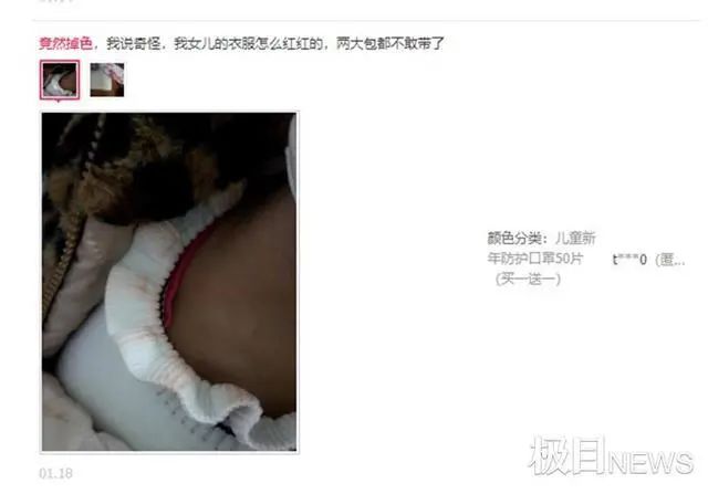 “便宜没好货,这褪色、这用料,劣质产品,不用多说了,看图吧”,文字后面,还贴出了孩子的白色羽绒服领口被染红的照片。 “口罩虽然好看,但有些掉色。” “白色毛衣的领子摩擦的都是红色,不敢用了。”