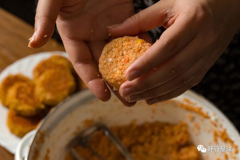 最后在盆里加入调料和一些重口味的菜:欧芹、香菜、韭菜、洋葱其中之一或几种混合,再佐以大量的盐,搅拌均匀,如此,原料就做成了。这时只需在油锅边用手把豆子泥捏成饼状或丸子状下锅油炸即可。