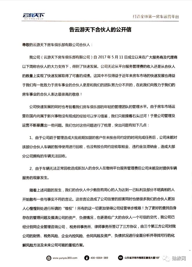 在云游天下发出的“告云游天下合伙人的公开信”中提到,由于车辆无法正常回收造成新加入的合伙人在缴纳平台服务管理费后公司未能及时提供车辆服务的现象发生。