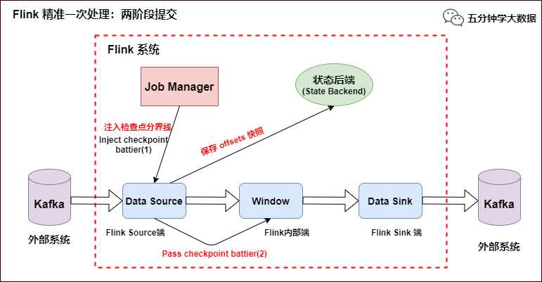 Flink 内部端:这个我们已经了解,利用 Checkpoint 机制,把状态存盘,发生故障的时候可以恢复,保证内部的状态一致性。不了解的小伙伴可以看下我之前的文章: