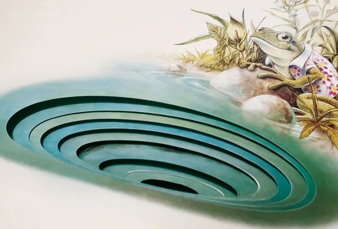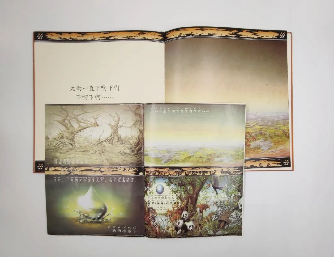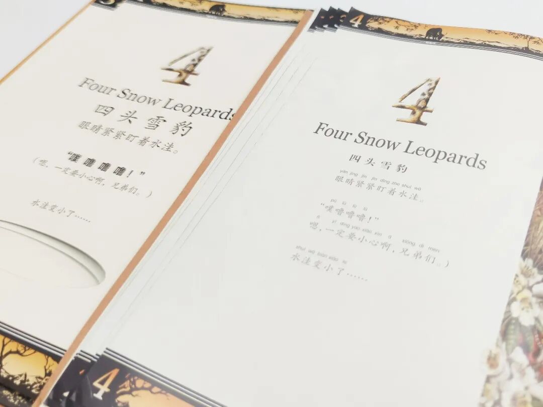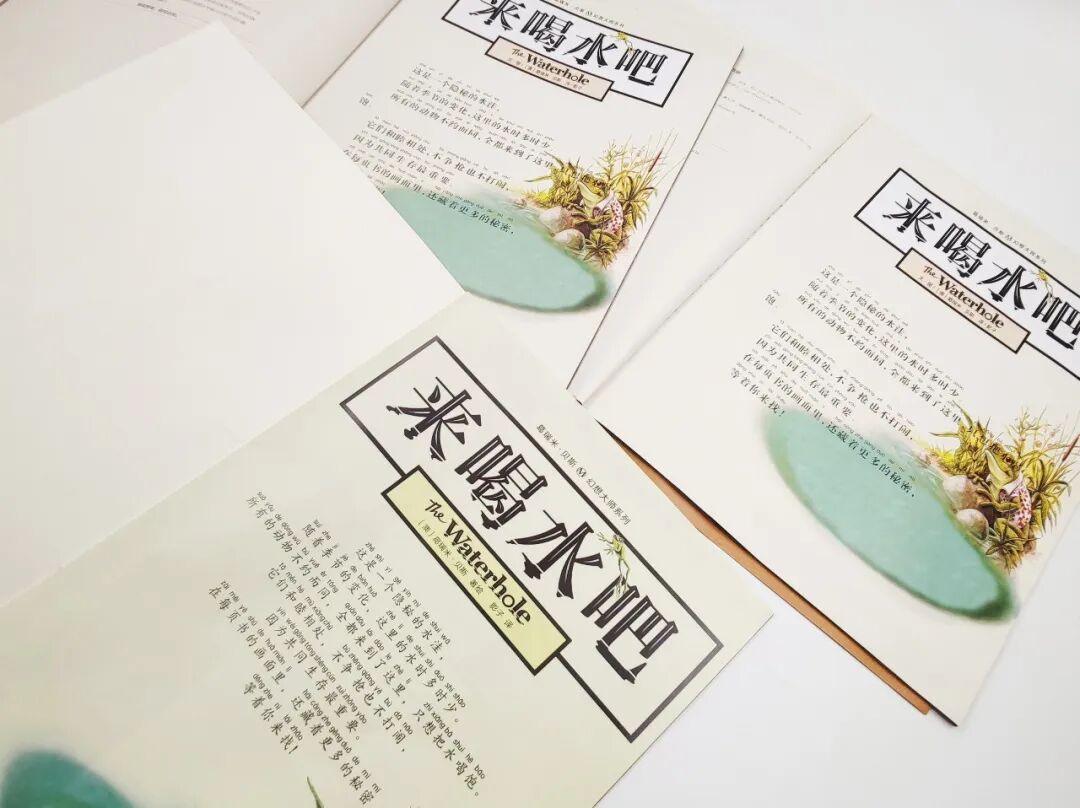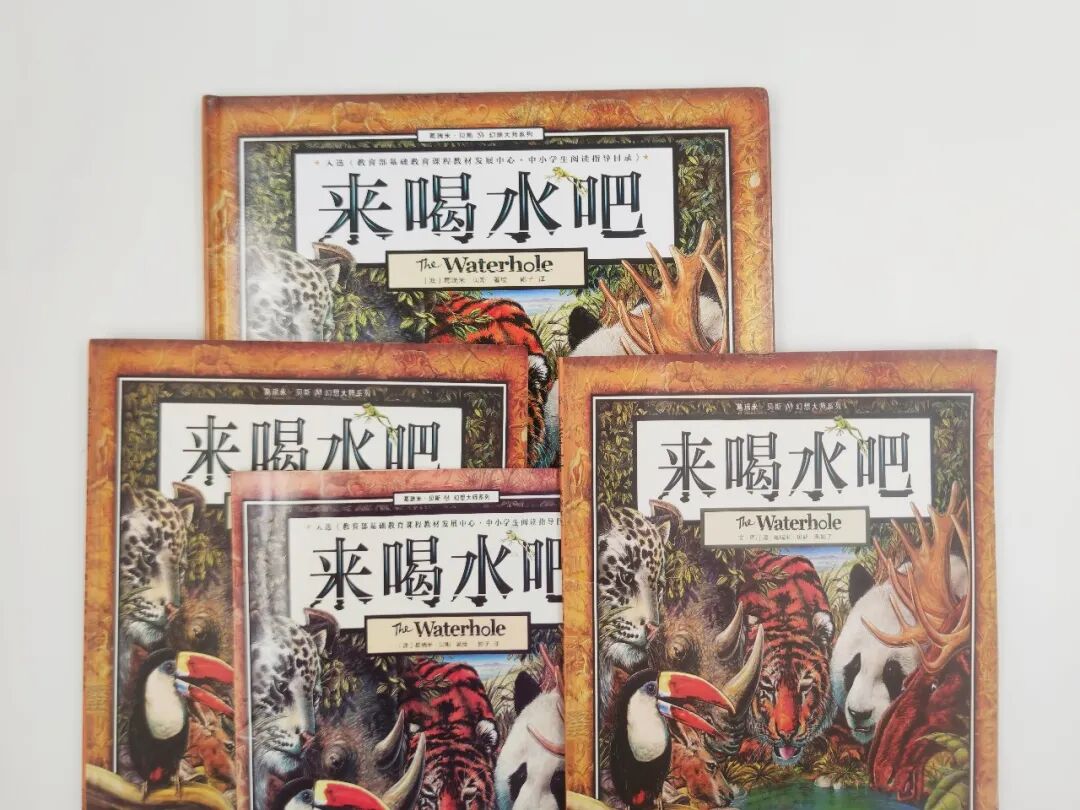 再以《来喝水吧》为例,正版采用有挖洞镂空的设计制作工艺。前十页里随着动物数量的变化,每一个镂空的水洞会越来越小,小读者会通过洞洞大小的变化,感受水位的变化,这也是很多孩子超喜欢阅读这本书的原因之一。