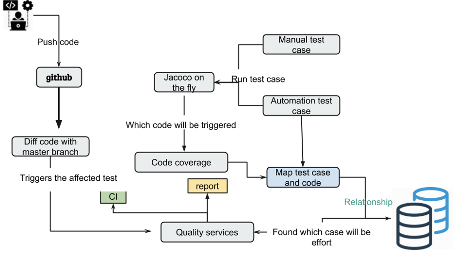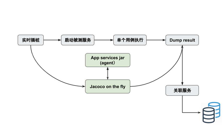 目前通用的解决方案是利用Jacocoon-the-fly模式基于 On-the-fly 方式无须入侵应用服务代码,启动脚本时,只需在 JVM 中通过 -javaagent 参数指定 jar 文件以启动 Instrumentation 的代理程序,该代理程序通过 Class Loader 装载一个 class 前判断是否需要注入 class 文件,再将统计代码插入 class ,测试覆盖率分析就可以在 JVM 执行测试的过程中完成。Jacoco提供了自己的Agent,完成插桩的同时,还提供了丰富的dump输出机制,如File,Tcp Server,Tcp Client。覆盖率信息可以通过文件或是Tcp的形式输出。通过外部服务在任意机器上通过api请求获取被测程序的覆盖率与执行路径。对功能测试用例,我们可以通过执行单个用例,经过上述步骤后拿到该条用例影响代码的覆盖率与执行路径。在通过关联服务,将具体用例的ID与生成的覆盖率信息(类,方法,行等)建立映射关系,最后将关联数据存到数据库中保存。基于Jacocoon-the-fly 模式获取单个用例覆盖率建立映射关系的流程如下:以上是基于java语言来关联用例与代码直接的关系,前端也有类似原理的工具,利用istanbul-middleware也可以实现同样的功能,具体请查阅一下这两篇文章,这里不再复述。