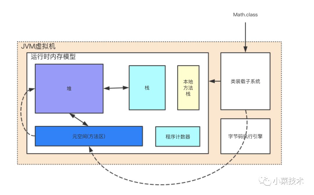 先经过类装载子系统装载,经由验证,准备,解析,初始化四个过程。方法被调用,方法进栈,对象放在堆,栈内存的引用指向我们的对象,方法逐行执行,由我们的程序计数器来控制。元空间放置静态方法,不占用jvm内存,占用的是实际内存空间。