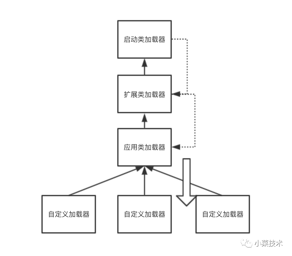 用技术一点的话就是类来了,交给我们的自定义加载器,自定义加载器先不做处理,交给我们的应用类加载器,应用类加载也先不处理,交给我们的扩展类加载器,扩展类加载器也先不处理,交给我们的启动类加载器,启动类加载器没办法了,先尝试加载一下吧,加载不了,回退给扩展类加载器,扩展类加载器也尝试一下加载吧,加载不了再交给我们的应用类加载器,应用类加载器还是处理不了只有回退给我们的自定义加载器了。