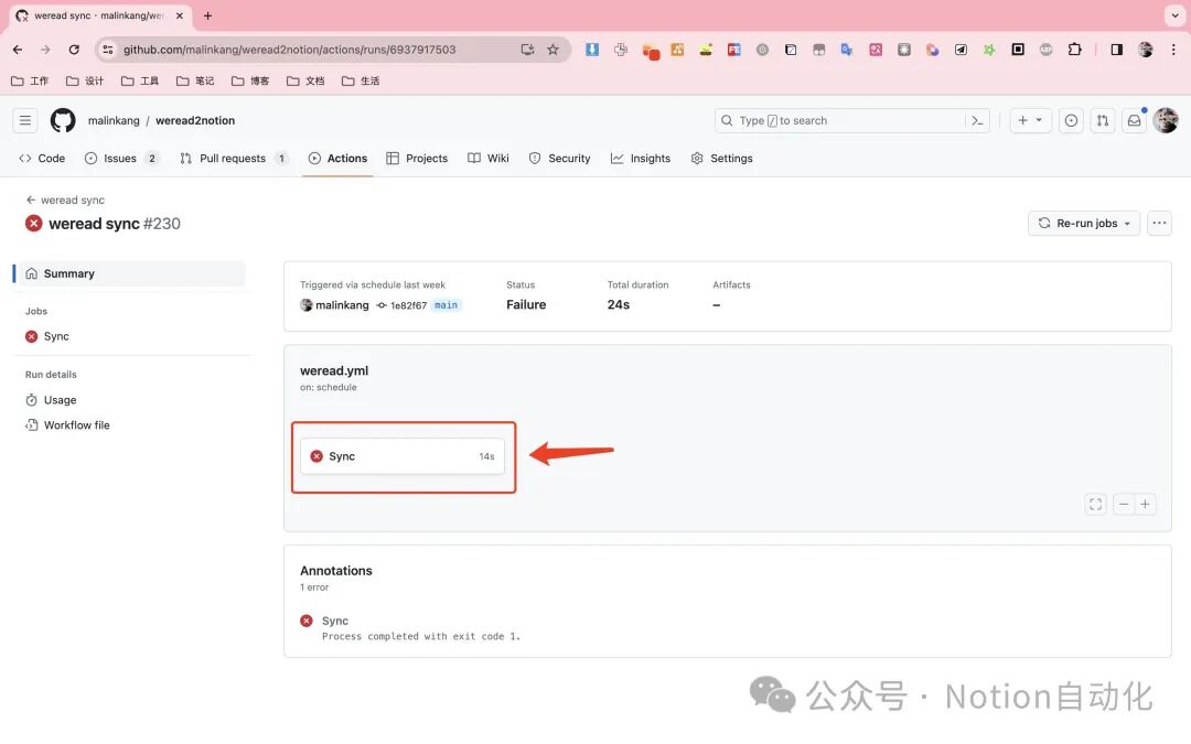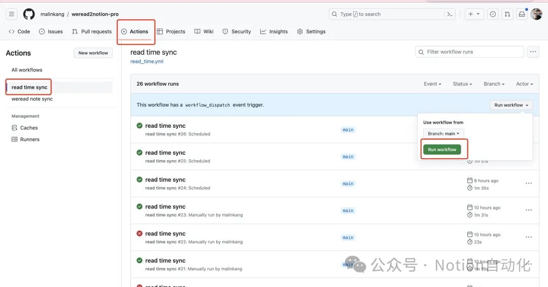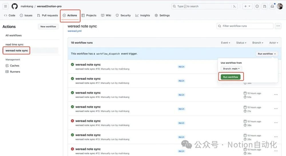上面配置完成之后,打开你Fork的项目,依次点击Actions->weread note sync-> Run workflow,就可以运行了。