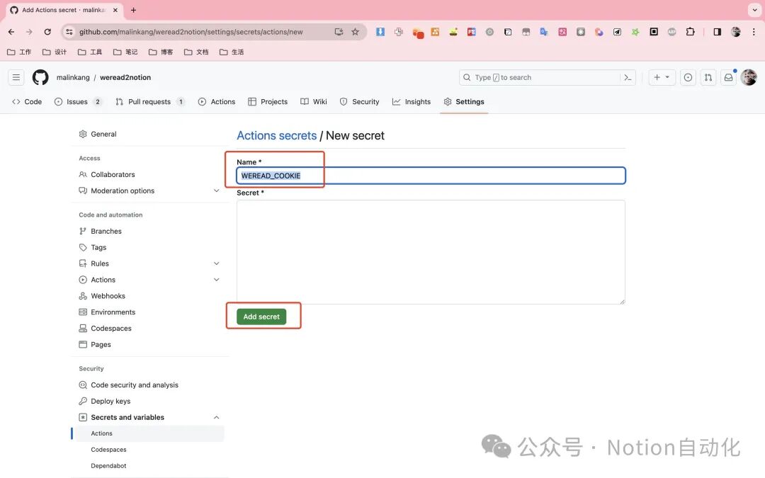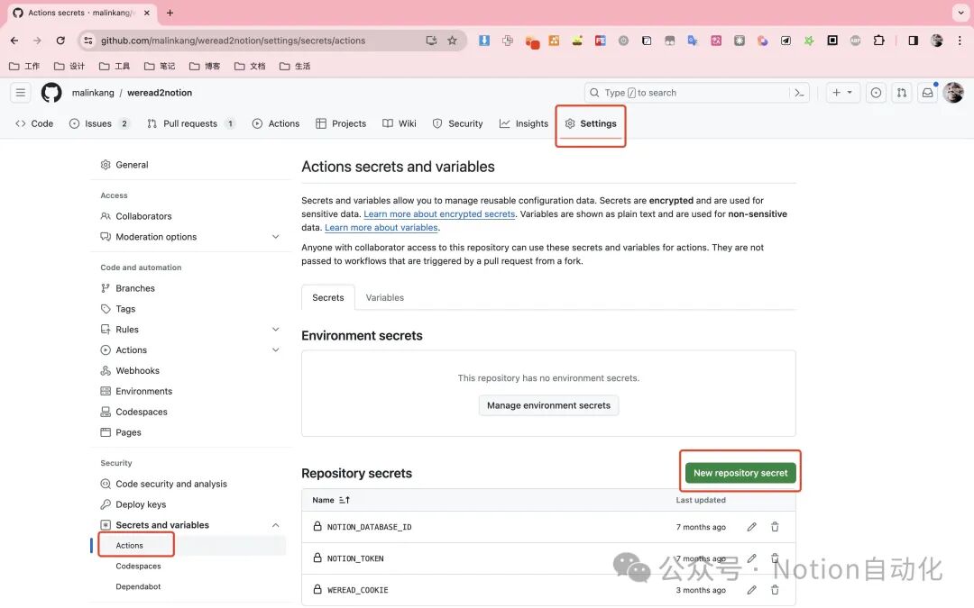 打开Weread2Notion-Pro:https://github.com/malinkang/weread2notion-pro,点击右上角的Fork(顺便点个star谢谢)