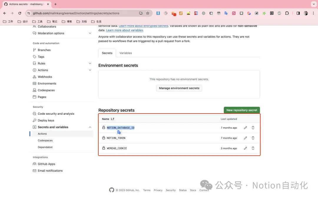 Database中的Formula和Rollup类型的属性名可以修改,其他的属性名不支持修改,因为代码中是通过属性的名字来增加修改这个属性的,修改了名字程序就无法正常运行。要修改数据库的名字需要按照以下步骤。依次选择Settings->Secrets and variables -> variables-> New repository variable。