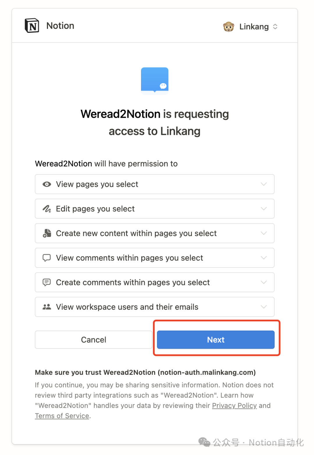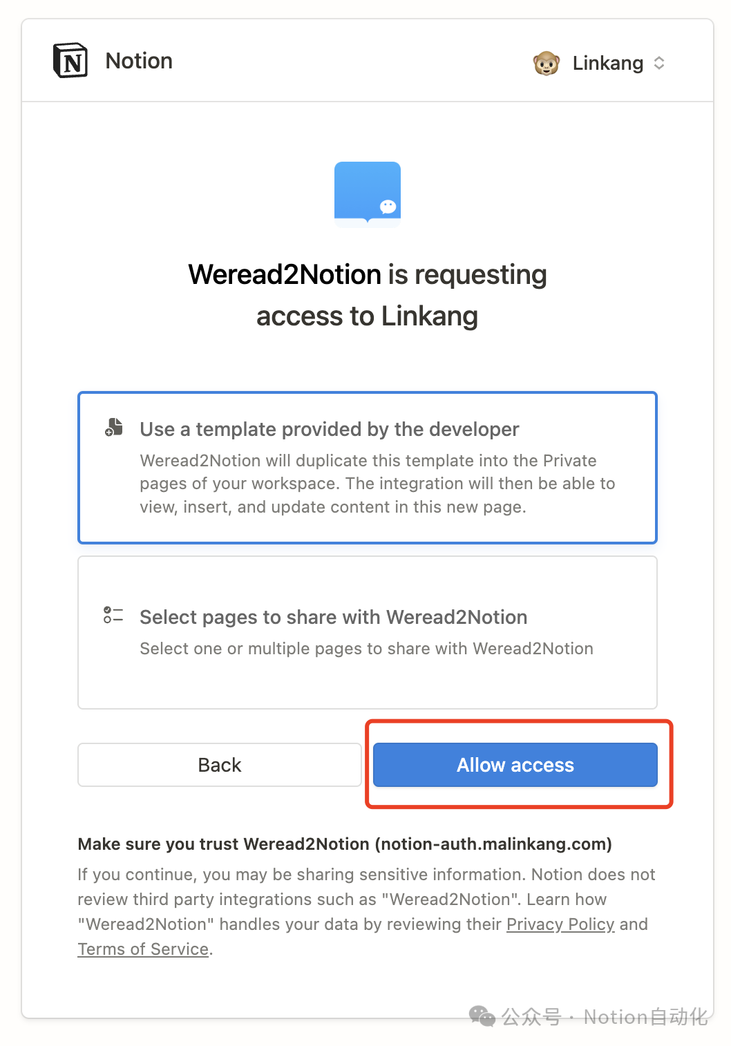 浏览器打开 https://api.notion.com/v1/oauth/authorize?client_id=f86ce456-f9cb-4cd5-8e4b-07bd9e18a8f8&response_type=code&owner=user&redirect_uri=https%3A%2F%2Fnotion-auth.malinkang.com%2Fweread2notionpro-oauth-callback