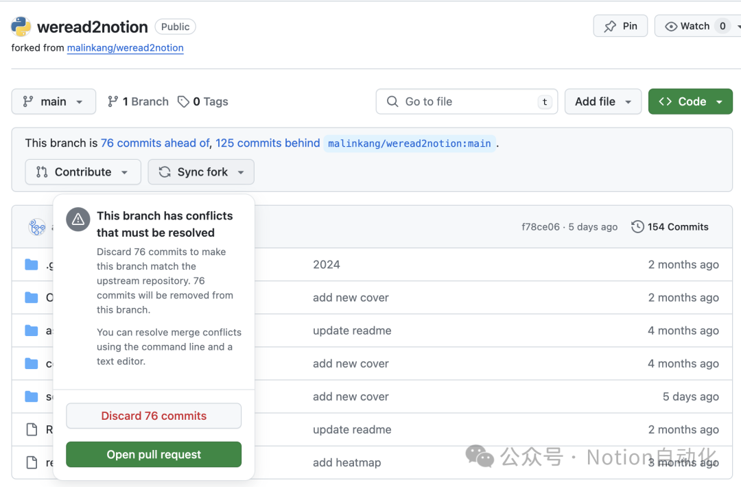 如果我添加了新功能,你需要将自己的代码与我的代码进行同步。打开你Fork的项目,点击Sync fork进行同步,如果有冲突可以点击Discard那个按钮
