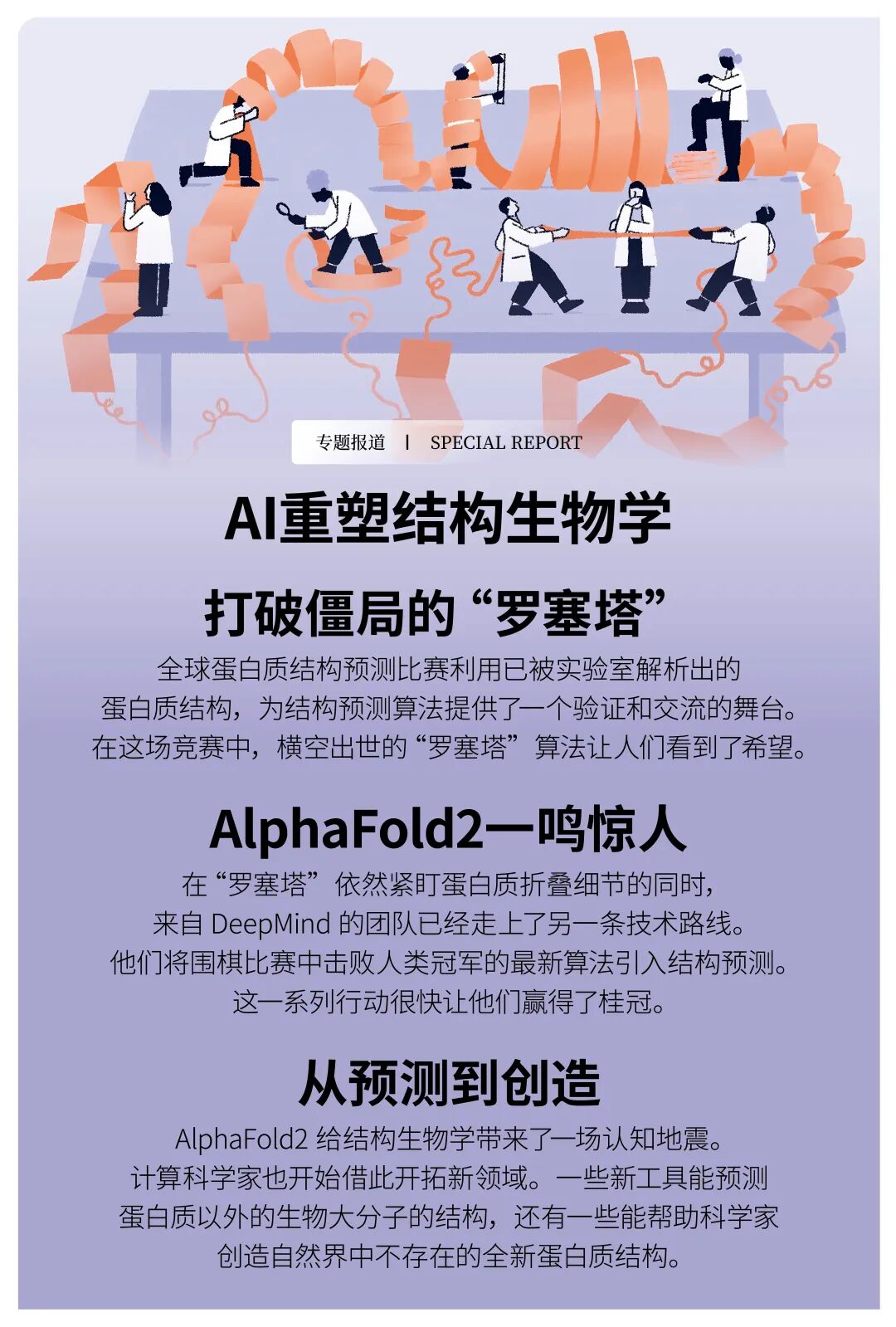 也许AlphaFold2最大的影响力是让生物学家注意到了AI的威力。它启发了新的算法,例如设计出自然界中并不存在的全新蛋白质,也催生了新的生物技术公司以及实践科学的新方法。它的新版本AlphaFold3在2024年5月上线,引领生物学预测技术进入下一阶段:构建蛋白质与其他分子(诸如DNA或者RNA)结合的复合体结构。“这是迄今为止最宏大的‘机器学习驱动科学’的故事。”库雷希说道。