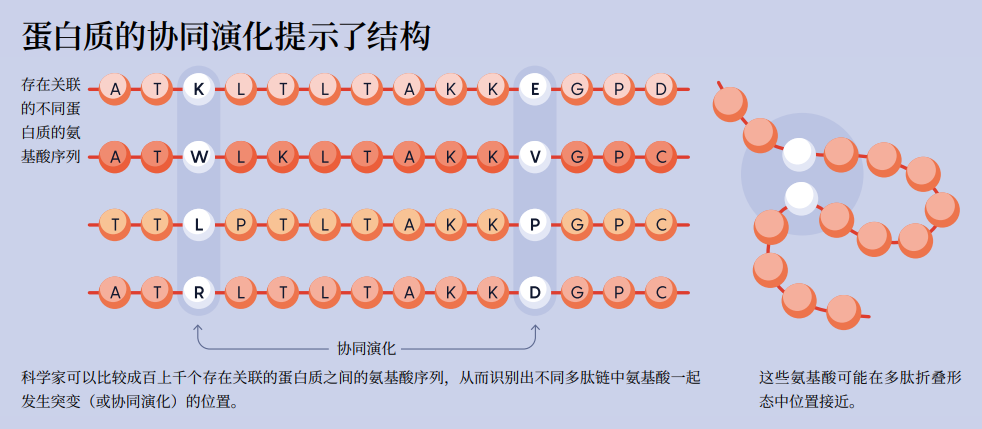 然而,人类的领先优势并没有持续太久。在21世纪10年代初,“协同演化”(co-evolution)这一概念的重大突破推动了领域的发展,后来还成为了AI预测工具诞生的关键。这一概念已存在了几十年,解释起来相当简单:通过比较数百个乃至数千个密切相关但彼此不同的蛋白质的氨基酸序列,科学家能够识别出那些发生了突变氨基酸,重点是,还能确定它们是否与其他氨基酸同步突变。如果两个氨基酸共同变化,它们很可能以某种方式相连。“你就能说:‘这两个氨基酸在空间上可能很接近。’”美国劳伦斯伯克利国家实验室(Lawrence Berkeley National Laboratory)的结构生物学家保罗·亚当斯(Paul Adams)解释道。