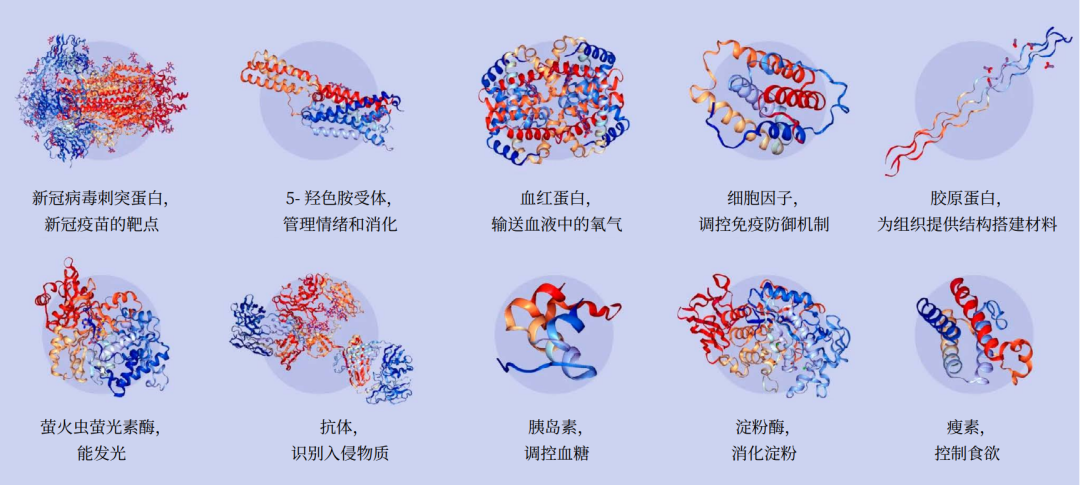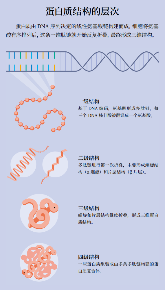 地球上已知的蛋白质种类上亿,未知的则更多。它们无所不能:血红蛋白和肌红蛋白在肌肉和身体中循环输送氧气。角蛋白为头发、指甲与皮肤提供结构框架。胰岛素协助葡萄糖进入细胞,转化成能量。蛋白质可以呈现无数形状结构,以匹配生命活动过程中无数的“工作需求”。“从原子到生态系统,(蛋白质结构)就像是一种通用语。”库雷希打比方道,“万物源自此处。”