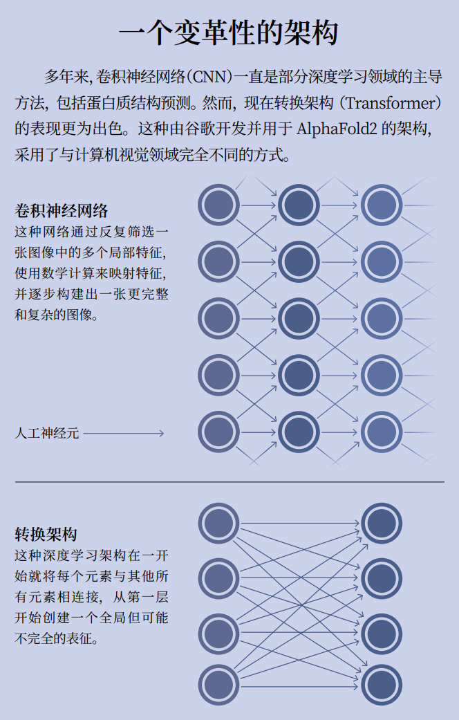 美国芝加哥丰田计算技术研究院(Toyota Technological Institute at Chicago)的教授许锦波(Jinbo Xu)也意识到了深度学习在解决蛋白质结构预测中的潜力。当时,计算机科学家在卷积神经网络(Convolutional Neural Networks,CNN)中取得了巨大成功,在这种网络中,算法会将图像分解为小块,并通过识别这些小块之间的模式来处理图像。受到这些图像处理网络的启发,许锦波将这一技术引入蛋白质结构预测。他使用一种叫做矩阵的数学对象,来描述在空间上彼此接近的氨基酸,然后将这个矩阵作为图像输入CNN。算法会在这些图像中寻找规律,以预测蛋白质中各个原子的三维坐标。
