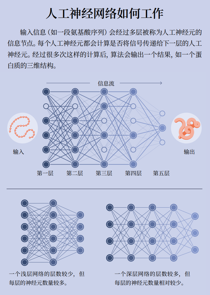 自20世纪90年代以来,包括琼斯和约翰·莫尔特(John Moult)在内的结构生物学家就一直在尝试将ANN应用于蛋白质科学。然而,浅层神经网络的局限性和稀疏的数据阻碍了他们前进。不过在大概十年之前,计算机科学家学会了如何更好地构建ANN,从而可靠地训练更多层的网络。ANN的深度从20层、50层、100层逐渐增加到数千层。“为了将这些新网络与上世纪90年代的ANN区分开来,人们开始称其为‘深度学习’,”利特曼说道,“如果说机器学习领域的人特别擅长哪件事,那一定是起一些有吸引力的名字。”深度学习彻底变革了人工智能,让算法不仅在图像和语音识别方面表现卓越,甚至在游戏中击败了人类。