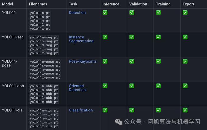 YOLOv 11附带了边界框模型(无后缀),实例分割(-seg),姿态估计(-pose),定向边界框(-obb)和分类(-cls)。这些也有不同的尺寸:纳米(n),小(s),中(m),大(l),超大(x)。