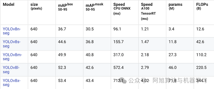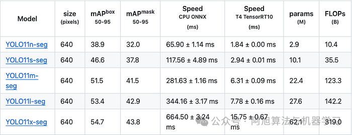 其中,Nano的mAPval在v11上为39.5,v10上为38.5;Small为47.0 vs 46.3,Medium为51.5 vs 51.1,Large为53.4 vs 53.2,Extra Large为54.7vs 54.4。现在,这可能看起来像是一种增量增加,但小小数的增加可能会对ML模型产生很大影响。总体而言,YOLOv11以0.3 mAPval的优势追平或击败YOLOv10。现在,我们必须看看速度。在延迟方面,Nano在v11上为1.55 , v10上为1.84,Small为2.46 v2.49,Medium为4.70 v4.74,Large为6.16 v7.28,Extra Large为11.31 v10.70。延迟越低越好。YOLOv11提供了一个非常低的延迟相比,除了特大做得相当差的前身。总的来说,Nano模型是令人振奋的,速度更快,性能相当。Extra Large在性能上有很好的提升,但它的延迟非常糟糕。分割:
