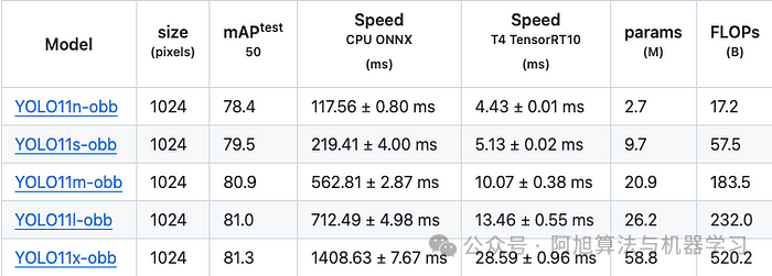 OBB统计数据在mAP 50上并不是很好,只有非常小的改进,在某种程度上小于检测中的微小改进。然而,从v8到v11的速度减半,这表明YOLOv11在速度上做了很多努力。