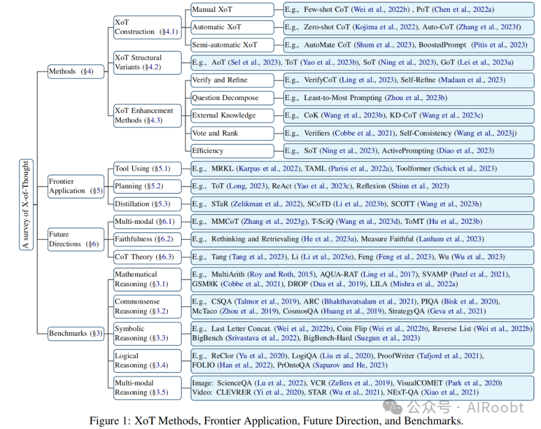 然而,这些方法和数据集尚未经过系统性的回顾和分析。为了填补这一空白,我们提出这项工作来进行对XoT家族的全面和详细分析。尽管已经有一些综述讨论了思维链,但它们仅限于特定方面,例如使用提示的LLM推理(Qiao等人,2023年)和思维链提示策略(Yu等人,2023c)。相比之下,我们的综述不仅提供了对他们已经涵盖的主题的更全面和全面的讨论,还包括了额外的主题和讨论,如XoT构建、XoT结构变体和前沿应用等。具体来说,在本文中,我们首先介绍了相关背景和初步知识(第2节)。此外,我们从多个角度仔细分类了XoT系列工作,并完成了深入分析(第4节),包括XoT构建方法(4.1节)、XoT结构变体(4.2节)和XoT增强方法(4.3节)。然后,我们提供了XoT在前沿领域的实际应用(第5节)。为了激发XoT后续工作的灵感,我们提供了对这一领域未来研究潜在途径的见解(第6节)。最后,我们比较并讨论了现有的方法(第7节)。