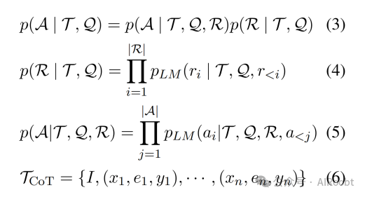 在思维链推理场景中,演示包含推理过程,我们需要最大化答案A和理由R的可能性,如公式(3,4,5,6)所示。