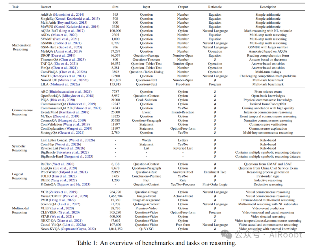 这里的符号推理特指模拟一些对人类来说简单但对LLMs来说具有挑战性的简单操作。最后一个字母串联、抛硬币和反转列表(Wei等人,2022b年)是最常用的符号推理任务。此外,协作基准测试BigBench(Srivastava等人,2022年)和BigBench-Hard(Suzgun等人,2023年)也包含了几个符号推理数据集,如状态跟踪和对象计数。