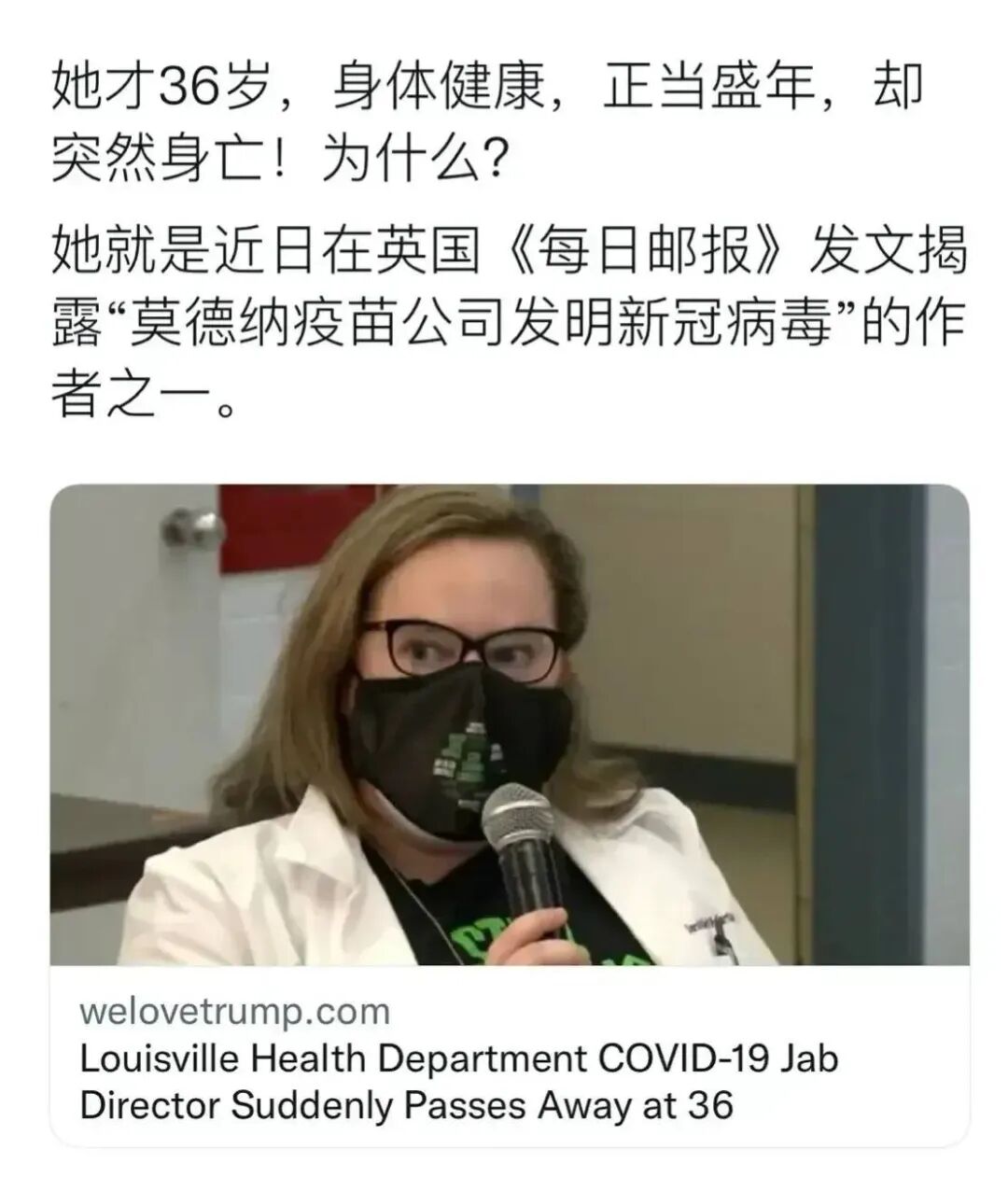 《纽约时报》等美国媒体月26日消息,美国肯塔基路易斯维尔公共卫生专员突遭车祸身亡,这名专家就是在英国《每日邮报》发文揭露“莫德纳公司专利当中拥有新冠病毒基因片段”的质疑者之一。显然在此时发生车祸,让人不得不浮想连连,懂的人都懂!在美国也就出现了一个斯诺登,算是逃出了美国的虎口。每一个至关重要的人物都是在那关键时刻离开了这个世界,而他背后自然有其不为人知的秘密已经被掩盖。