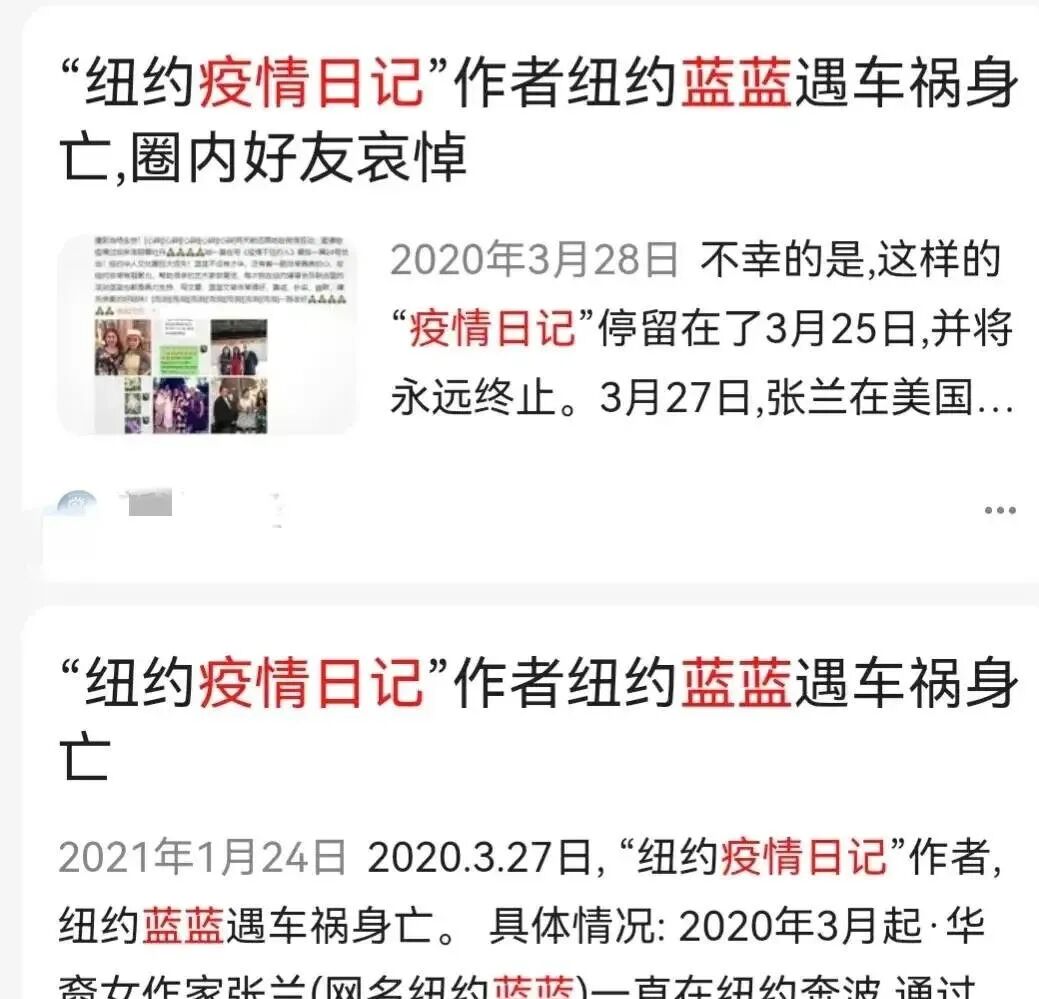 英国媒体也直接指出,美国与病毒存在关系的可能性很大。现在这名卫生专家突然意外遭遇车祸身亡了,估计他披露的内幕也很难得到验证了。虽然这名美国专家是车祸身亡,但是这名专家刚刚披露美国公司与病毒有关的内幕就遭遇车祸身亡,还是引起了不小的怀疑。确实外界怀疑,这名专家车祸太离奇了。事实上,美国类似离奇死亡的事件经常发生,2020年,《纽约疫情日记》作者蓝蓝,用真实的镜头记录下了美国纽约等大城市遭遇疫情之后的悲惨现状。不久之后这名作者就被卡车撞死了,她的离去也让这种报道美国社会疫情真相销声匿迹。
