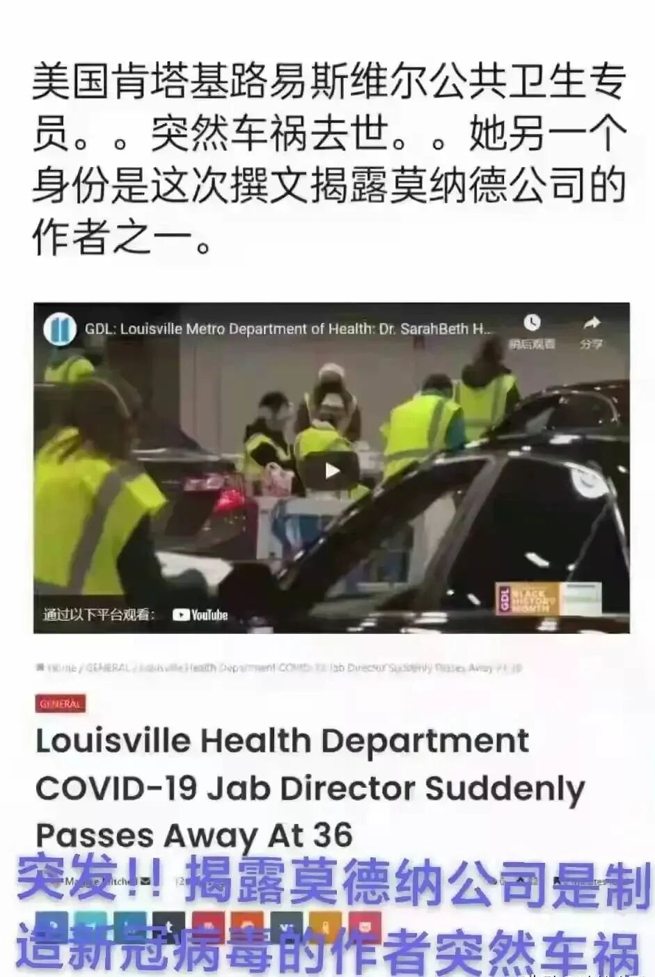 同样在2020年,在美国研究新冠病毒起源的华裔科学家刘谋宣称对新冠病毒有重大发现,可是在他还没有宣布发现结果呢,不久之后这名科学家就遭遇了枪杀意外。由于美国警方草草了事,根本无法追查太多令人怀疑的细节。如今这位揭露莫德纳在2016年就已经发明新冠病毒基因片段的质疑者,在昨晚就遭遇了车祸。谁又能认为这样的车祸会是真正的意外呢?懂的人都懂,毕竟某些人和某些组织乃至某个国家是要掩盖一些秘密,不想这些秘密被爆料出来。