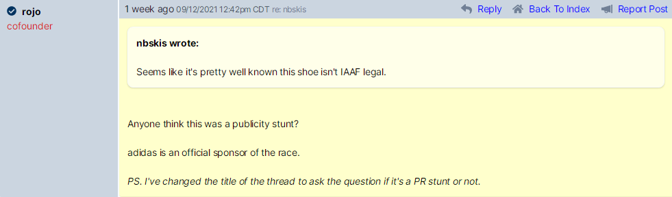 在当前的网络及媒体环境下,马拉松运动员穿的跑鞋鞋底厚度超过了允许限度1㎝,就可能被取消成绩,这是不可抗的。这一故事被世界各地的主流媒体争相报道,在奥地利媒体笔下,将之描述为“Schuh-Gate”——跑鞋门。 “跑鞋门”可能已经为维也纳城市马拉松赢得了连篇累牍的媒体报道,这并不是一项以距离而著称的赛事,可以肯定的是,这场比赛获得了预想之外的宣传。因为一个肉眼可见的技术问题而取消男子冠军的参赛资格可不是什么好事。 这桩事件是怎么发生的呢?根据新闻通稿,所有精英跑者在比赛前都必须填写一份表格,说明他们计划穿哪双跑鞋参赛。显然,胡里萨或是他的经纪人在表格上提交的是合规的公路跑鞋,但他在比赛日选择了Adizero Prime X,一双在训练中一直使用的跑鞋,他没有意识到这双鞋不在世界田径协会路跑用鞋名单之上。