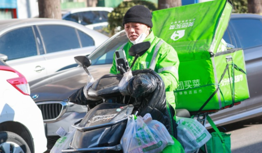 ▲发烧到39.4℃的女孩在社交平台上给吴姗姗留言。受访者供图12月12日,孙晴先后在三个生鲜平台抢菜,或是点开后发现“本站点当前运力已约满”;或是刚选购好商品,点击付款时显示商家“已休息”;或是付款后,许久未有人接单,最后只能申请退单。12月13日,孙晴定了六点半的闹钟起来抢菜,买了将近两百元的食物,包括一袋十斤大米,“独居的生活总要防患于未然”。而这一单,直到下午五点才送到。这几天,孙晴站在窗户边,经常看到有电瓶车停在楼下,配送员小小的车辆几乎被前前后后挂着的几十个包裹盖住,跑着下楼的配送员很快又骑着车匆匆而去。在配送的另一端,由于大面积感染,外卖等运力紧张的情况已经持续了一段时间。在张永新所在配送站,“运力已约满”一般出现在下午六点以后。而记不清楚是从上周哪天开始,几乎是在他早上七点到达站点,准备开始配送时,已经“爆了”。这意味着当日这个站点的分拣量和配送量都已经达到上限,平台无法再接单。除了订单的数量增多,每一单货物的数量也在增多,“都是米面粮油等囤货大件儿”,重达30公斤以上的订单偶尔也会出现。张永新把电瓶车的后备厢、前踏板,护杠和车把等能利用的地方全部利用上,挂得满满当当。他计算过,从12月初开始,平均一天没有低于100单,最高峰时,他一天送了130多单。12月12日早上6点45分,张永新上早班。自从进小区不再查看核酸报告后,配送站的配送员们进门前的第一件事是做抗原检测,然后进行全身消毒。防护措施是站点的强制性要求。比如配送时需要佩戴N95口罩,一趟下来,张永新就需要更换一个口罩。