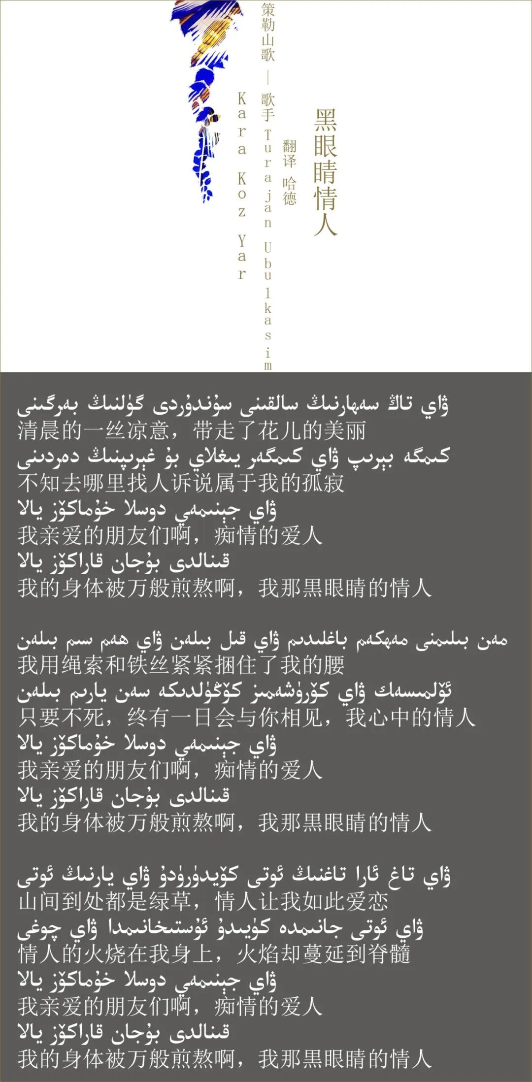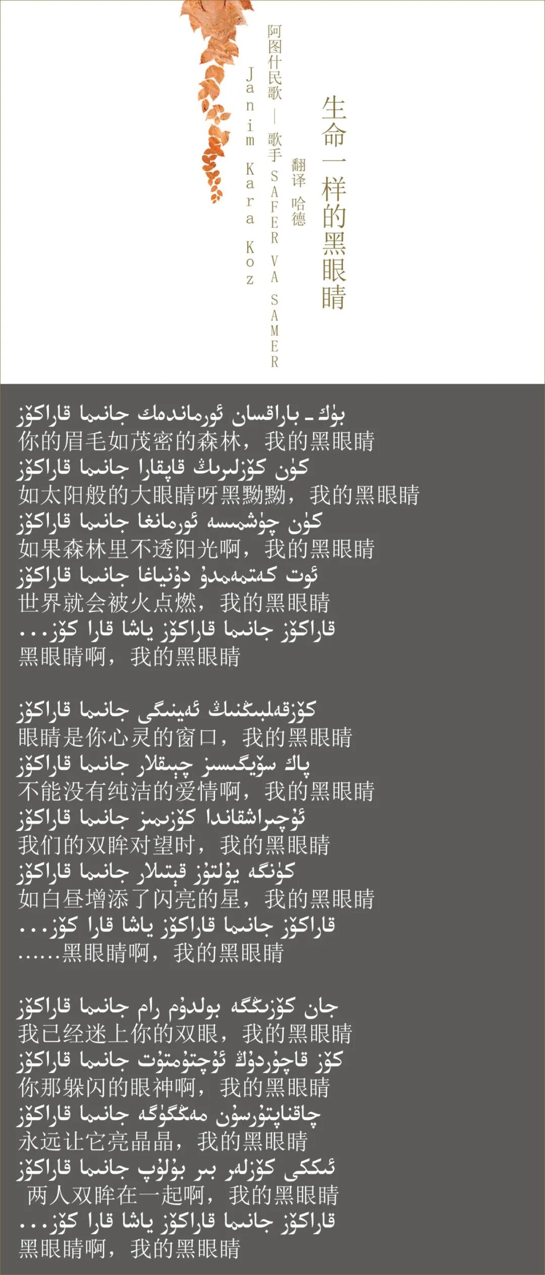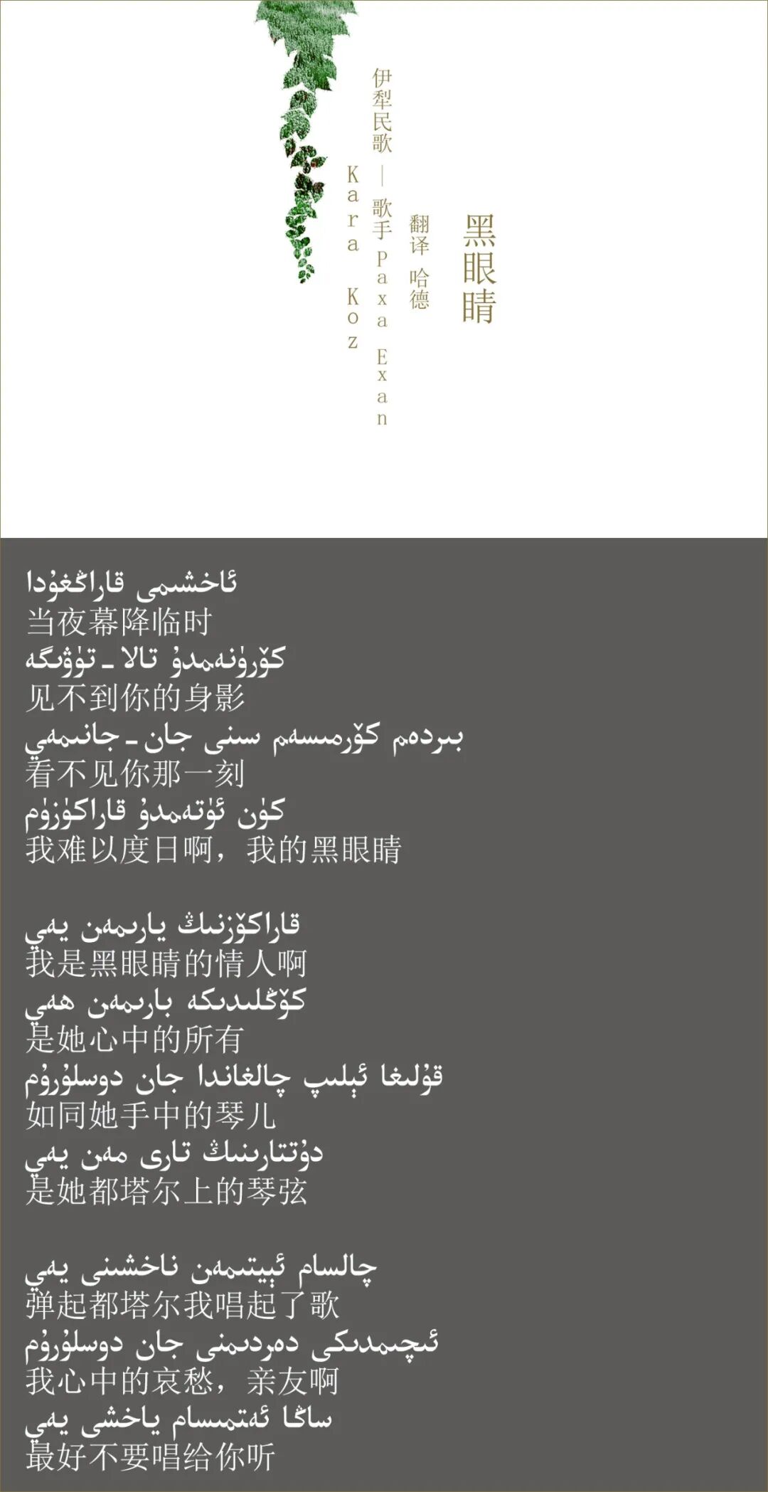 我在南天山上柯尔克孜人的牧场过的除夕。没有电,没有信号。只有天山。夏塔河冰层下的溪流声,夜晚木头房子外的风声,炉子上烧开的水吱吱地等候着奶茶。透过蒙着塑料布的小窗,到处是耸立的冰峰。从乡间奔跑的三轮摩托,到伯乡的街头,都可以听到维吾尔民歌。冬日里,音乐能让你看到夏日长满桑叶的桑树。它们摆动间,散落下无数光明。在这些歌声中,总有一双维吾尔的黑眼睛。炙热,清澈,青春里一闪一闪的样子。كۈنگە يۇلتۇز قېتىلار「像白昼的天空增添了许多星星」,维吾尔民歌里这么说。从北疆到南疆,维吾尔民歌中有许多首「黑眼睛」。它们旋律与风格迥异,却都是青春的具象。晃动着我们每一个人青涩的身形。看得见,能听到,让人一下子扑向珍贵的生活。维吾尔语黑眼睛是 kara koz (读“喀拉库兹”)。Kara 黑色,koz 眼睛。蒙古语里黑色也是 hara(卫拉特蒙古人读kara)。除了黑色,hara 在蒙古语里还有「清澈」、「纯真」的含义。比如白酒,蒙语是hara elik(酒),不是「黑酒」,而是清澈透明的酒。维吾尔语的 kara 没有「清澈」的意思,但有大、广阔和伟大(古义)的含义。新疆有很多地方叫「喀拉苏」。「喀拉」就是 kara,「苏」是水、河流。喀拉苏不是「黑水」,而是「大水」或「宽阔的河流」。「一个人的地理志」最初推送维吾尔民歌时,有读者想听伊犁民歌《黑眼睛》。在所有维吾尔「黑眼睛」民歌中流传最广的大概是伊犁民歌 kapkara koy kozlukm《眼睛黑如羊眼》。它是伊犁传统民歌(kona nahshilar)套曲(yurush)中的一首,一般翻译为《黑眼睛》,或《黑眼睛的姑娘》,也就是作家王蒙一直说的那首。内地听到的是巴哈尔古丽的改编版本,有汉语翻译,但与维吾尔民歌原词相去甚远。这次选编的2个传统伊犁民歌版本中,第一首是单曲,第二首是套曲,是维吾尔民歌皇后赛努拜尔·吐尔逊 Sanubar Tursun 版。套曲是说一套曲子里有好几首民歌,这是伊犁维吾尔族演唱民歌的方式。歌曲之间自然过渡,不中断。看似演唱方式,更觉得它指向一种淋漓尽致的生活方式。歌词的整理、翻译、编校都来自师弟哈德,兴致来了熬通宵。无法旅行的时候,像现在,我随维吾尔民歌而行。我一直在说,青春只有一次,而青春的旅行于生命不止。![]()