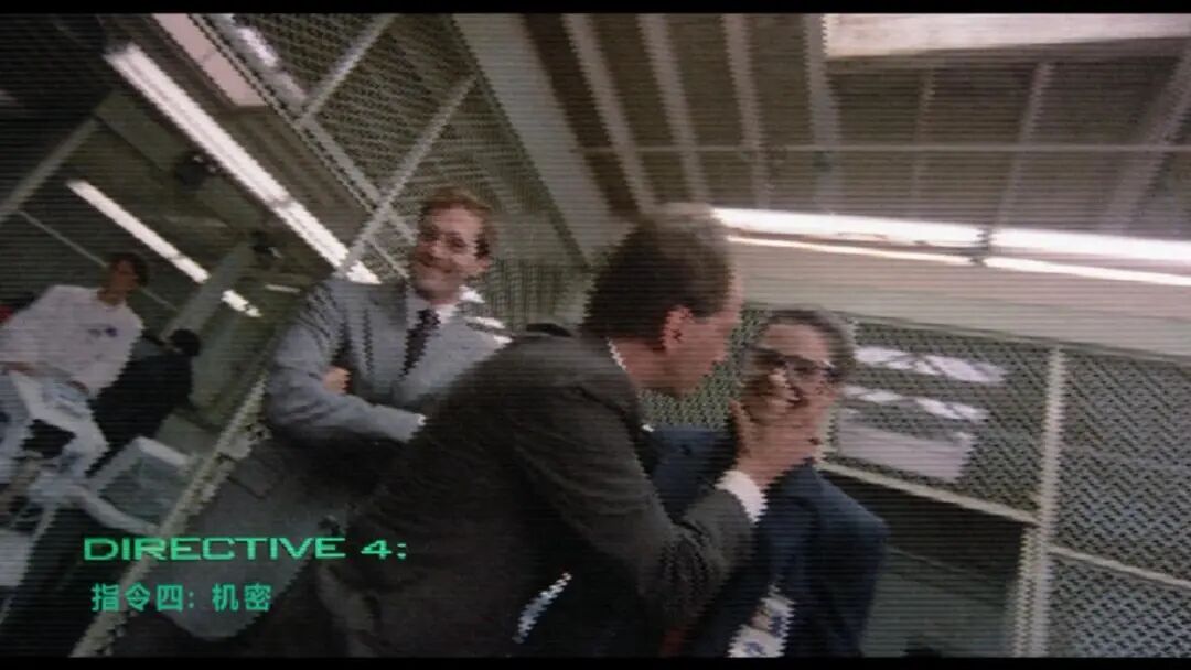最后应该强调,游戏的新式影响将人工性上升到美学的高度。柯南伯格的《感官游戏》(eXistenZ)和《黑客帝国》完全不同,出了名地回避了CG和数字处理,却仍然捕捉到了游戏的特质。不同于《黑客帝国》通过视觉效果实现,柯南伯格通过场面调度,特别是影片的动作和对话阶段,暗示了游戏性。这部电影自负的一点在于,所有的动作都发生在游戏中,观众也因为影片的标题“eXistenZ”相信这一点。随后观众发现这只不过是一场游戏里的一场游戏,外在于真实世界,最终的结局依然是开放性的,因为人物角色最终陷入神经症的螺旋之中。诚然,影片的叙事层面是关于游戏,但是影片之中生硬的对话和无端的情感才是《感官游戏》最像游戏的部分。回合制游戏如RPG等有着不同的节奏和对话呈现方式。在这类游戏中,语言的节奏是独一无二的。语言是交互性的,在简单的分支结构或超文本结构中重复出现。语言一般情况下是功用主义的而非叙述导向。游戏的幕间通常会给予玩家线索,接下来如何行动。这些写下来或说出来的线索作为摘要或策略备忘摘录或重复下来。在游戏中,语言通常用来传递事实或总结分数,统计。《感官游戏》的语言遵循游戏的对话逻辑而非电影的对话逻辑。弥漫诸场景之中的生硬对话实际上借用了游戏文本的对话方式。无论是“eXistenZ”游戏叙境中角色偶然地陷入僵持模式,并且必须强调姓名,并提示他们等候,以便游戏的对话继续进行,还是在游戏之外(当然或许仍然在游戏之内,只是我们不知道而已)若干角色不断用机器般的单一语调重复“eXistenZ by Antenna . . . eXistenZ by Antenna”,影片都会重复罐头对话。埃多·斯特恩(Eddo Stern)认为,“《感官游戏》的这些角色模仿了计算机生成的角色。”遵循,“自闭的对话算法。”[19]