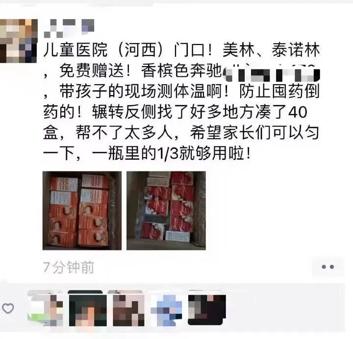 80后高瑞开着车,来到河西区的一家儿童医院门口,拿出40盒用于儿童退烧的美林(布洛芬混悬液)和泰诺林(对乙酰氨基酚混悬液),免费发放,同时发了一条带图的朋友圈扩散:“带孩子的现场测体温啊!防止囤药倒药的!”